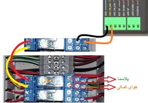5- بعضی دستگاه های برنا ابزار رله 3 یا 4 کنتاکت برای پلاسما دارند، اما اگر دستگاه شما مانند تصاویر رله 2 کنتاکت داشت و نخواستید هوا برش را از مدار خارج نمایید یک رله با پایه رله (هم ولتاژ با رله ای که بر روی دستگاه نصب هست ) تهیه فرمایید و مانند تصویر زیر روی ترمینال فلزی نصب نموده و اتصال سیم های آن را مطابق تصویر زیر انجام دهید.