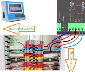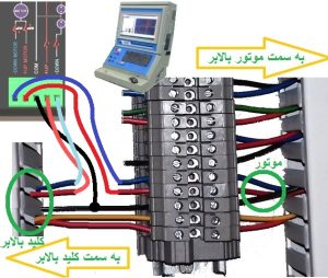 9- برای موتور بالابر در سیستم های برنا ابزار 2 مدل تابلو برق وجود دارد که در تصاویر برای هر دو مدل توضیح داده میشود. شما می بایست سیمهای قرمز و آبی که از سمت کلید آمده است را از زیر ترمینال باز نموده، به آنها سیم اضافه نمایید و چسب برق بزنید. سیم ها را به سوکت پشت کنترل ارتفاع پایه های UP و DOWN ببرید، سپس از پایه های UP MOTOR و DOWN MOTOR سیم متصل نموده و زیر پایه های همان ترمینال هایی که سیم ها را باز کردید، ببندید. از پایه COM هم یک سیم مشکی به سیم مشکی ترمینالها متصل نمایید.